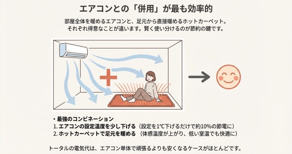 エアコンの設定温度を少し低めにして、足元をホットカーペットで支える。これが一番効率的!