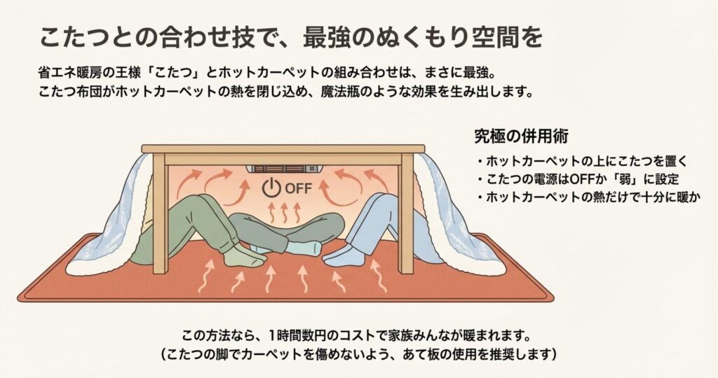 そして、最強の節電コンビと言われているのが「ホットカーペットの上にこたつを置く」という方法です。これ、実はお客様の間でも定番のテクニックなんですよ。