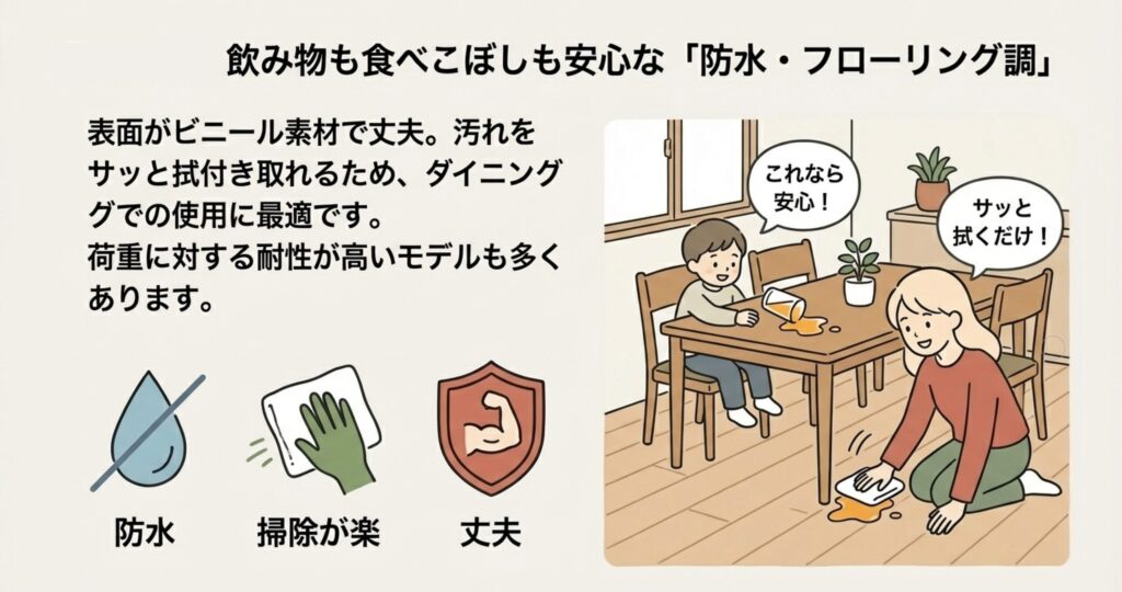 ダイニングって食べこぼしがどうしても気になる場所ですが、これならお掃除も楽々。2面切り替え機能がついているモデルなら、人がいない側の電源を切って省エネもできちゃいます。