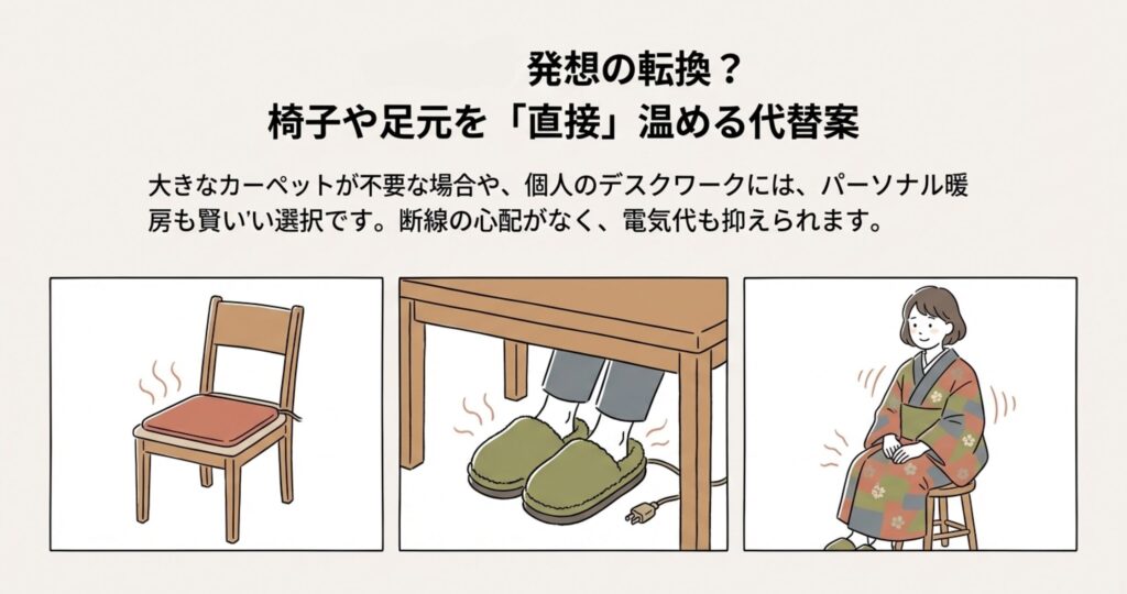 「そもそもカーペットを敷くほどじゃないかも」という方や、一人暮らしのデスクワークなら、椅子そのものを温めるという発想もありですよ。