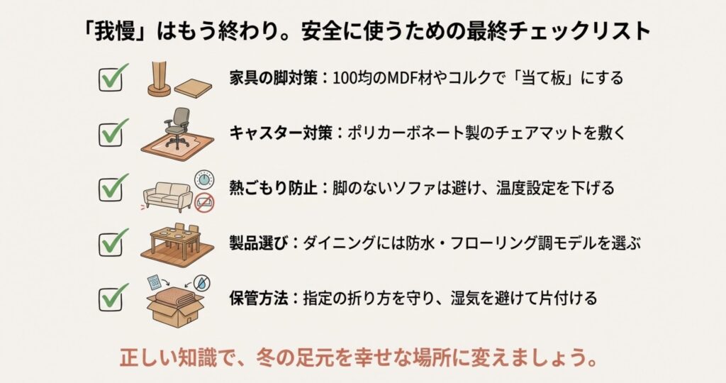 結局のところ、ホットカーペットの上にテーブルや椅子を置くのは大丈夫なの?という問いに対する答えは、「しっかり対策をすれば大丈夫、でもそのまま置くのはNG」というのが正直なところです。