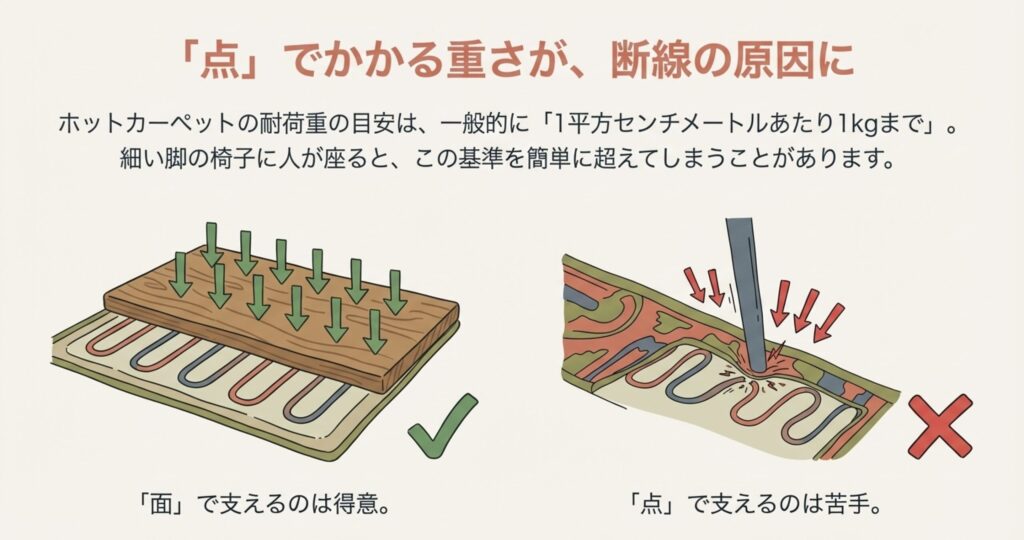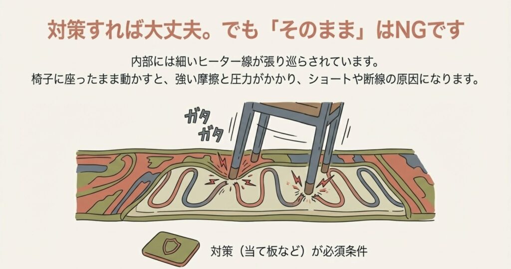 ホットカーペットの内部には、細いヒーター線が波打つように張り巡らされています。その上に椅子を置いて、さらに座ったまま「ガタガタ」と動いたりすると、線に強い摩擦と圧力がかかってしまいます。
