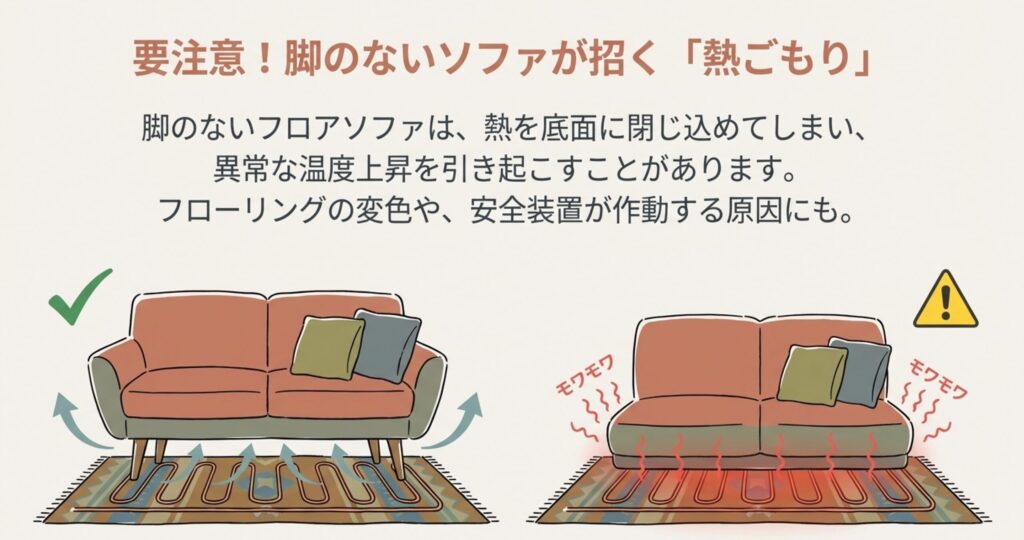 脚がないタイプは一見、重さが分散されて良さそうに見えますが、実は「熱ごもり」という別のリスクが発生します。カーペットが発する熱がソファの底に閉じ込められてしまって、異常に温度が上がってしまうことがあるんです。