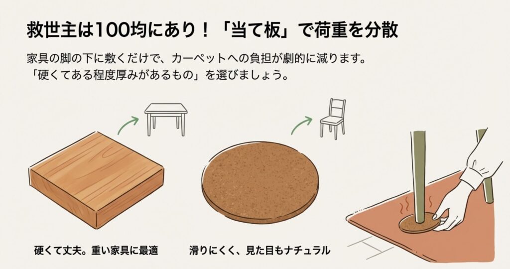 使い方は簡単。家具の脚の下にこれらを敷くだけです。これだけで、細い脚にかかっていた荷重が板全体に広がって、カーペットへの負担が劇的に減ります。