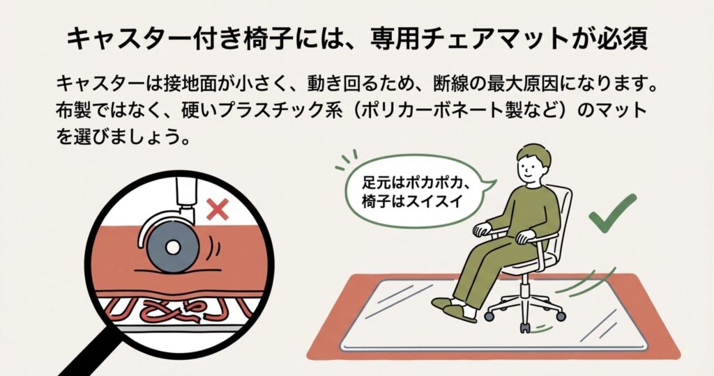 キャスターって、接地面がすごく小さい上に、座ったままコロコロ動かしますよね。これ、カーペットの中の線を「しごいている」のと同じ状態なんです。対策なしで使うと、あっという間に断線してしまいます。