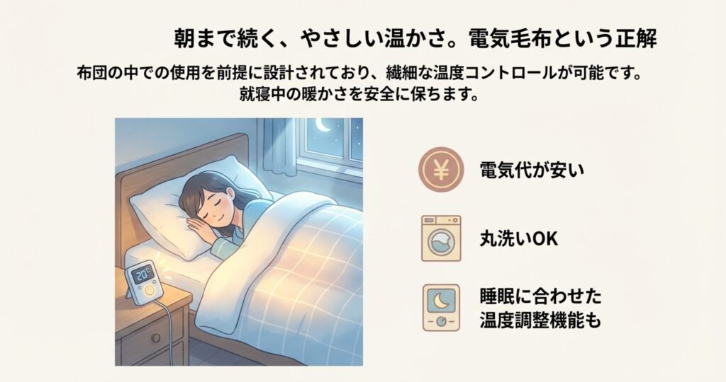 「寝ている間もほんのり温かさが欲しい」なら電気毛布。