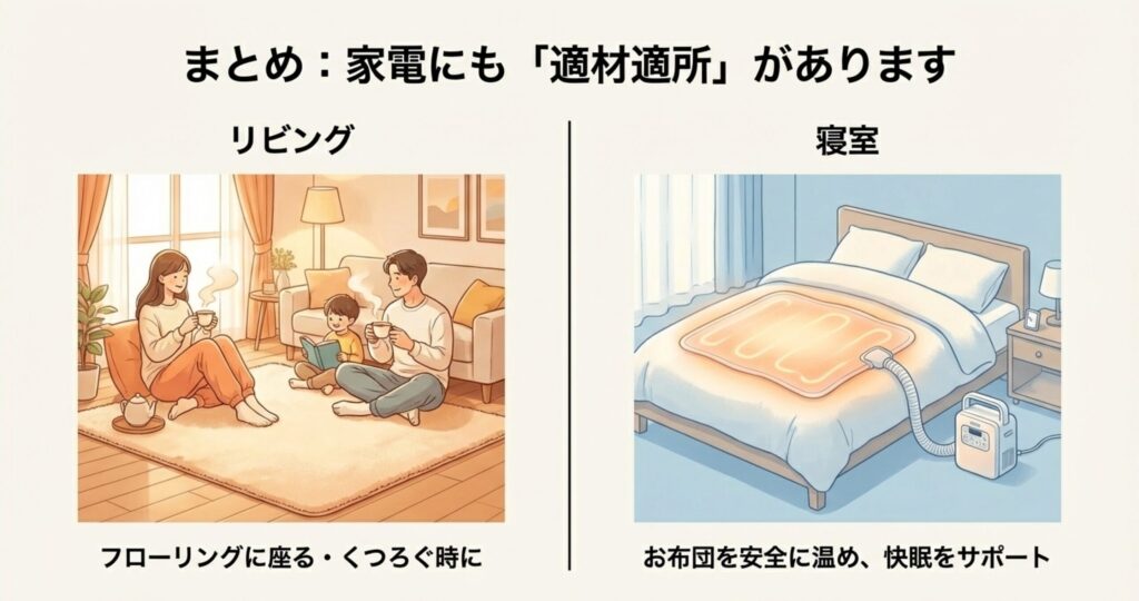もし寝室の床を温めたいなら、お布団を敷く前に電源を入れて温めておき、寝る時には必ずオフにするのが一番安全な方法ですね。ちょっとした心がけで、家電もあなたも守ることができますよ。