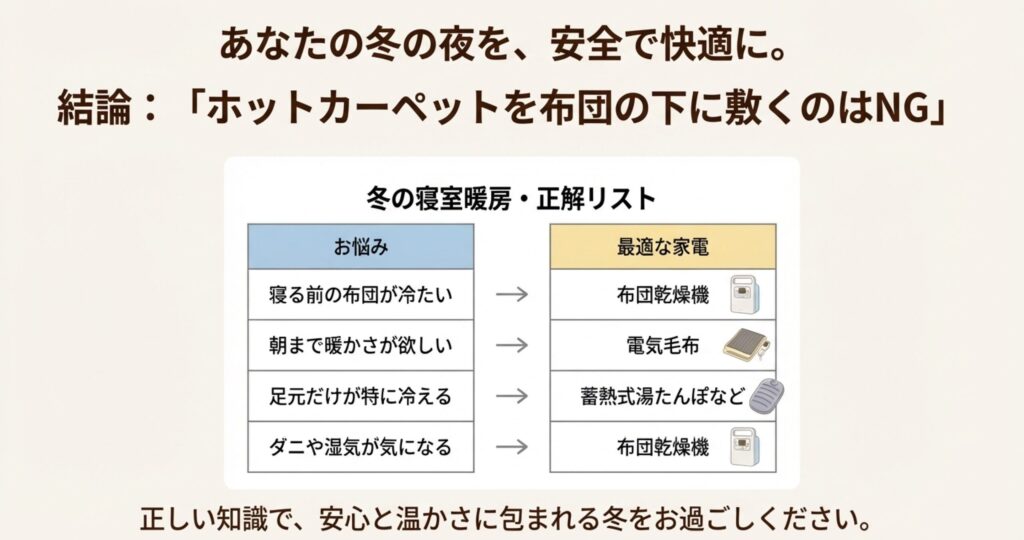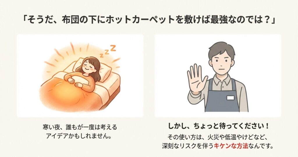 「そうだ、ホットカーペットを布団の下に敷けば最強に温かいんじゃない?」なんて、ふと思いついたあなた。ちょっと待ってください!