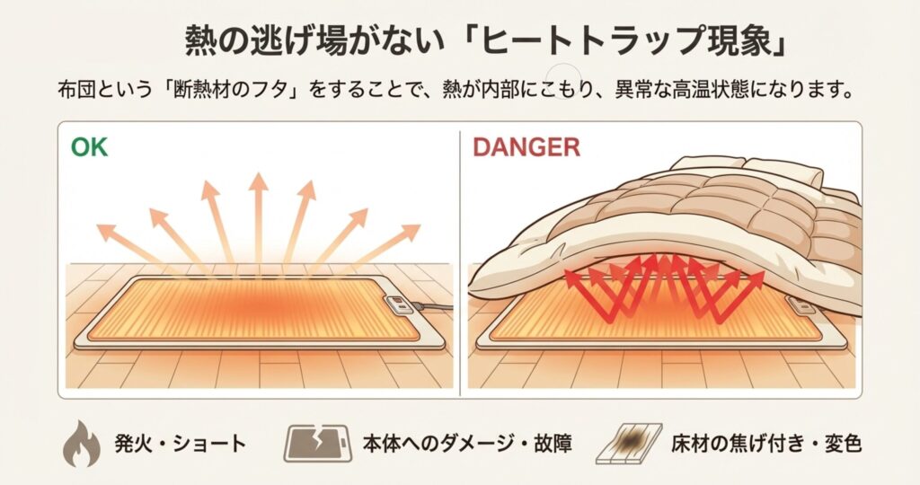 ここでは、ホットカーペットをお布団と一緒に使うことで起こる物理的なリスクについて詳しくお伝えします。