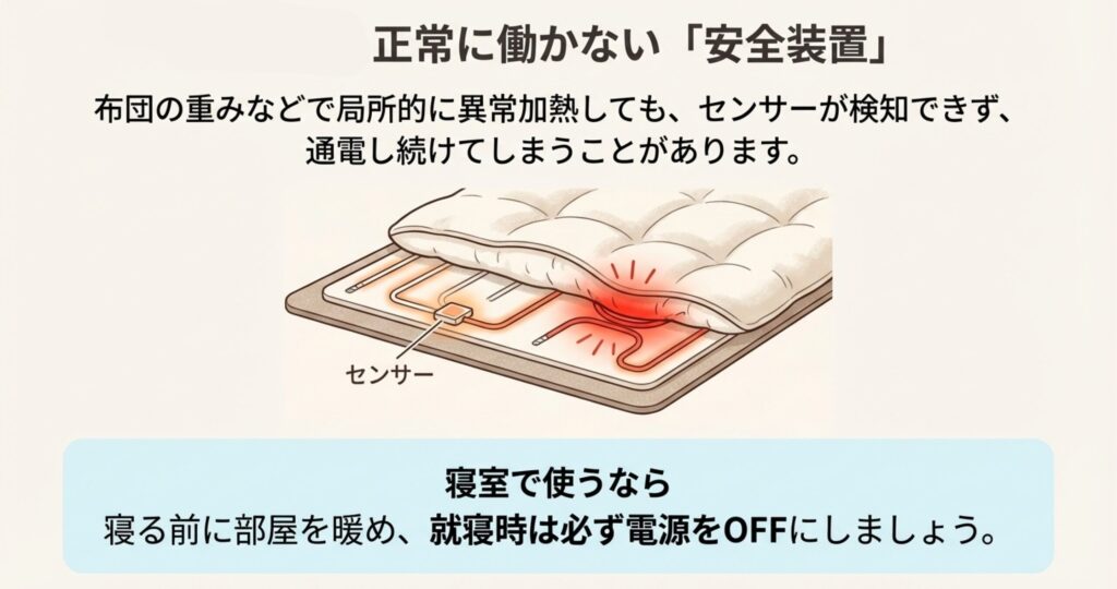 例えば、センサーがある場所だけが温まっていて、別の場所にお布団の重みがかかって局所的に熱くなっている場合、機械は「まだ温度が足りない」と判断して通電を続けてしまうことがあるんですよ。