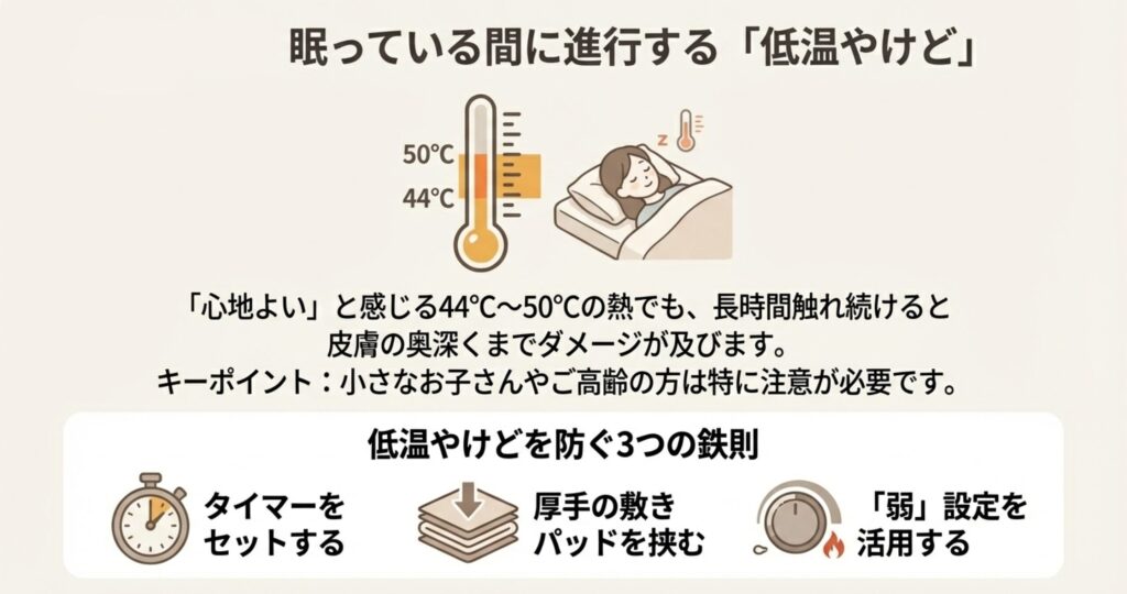 私も昔、こたつでうたた寝して足がヒリヒリした経験がありますが、あれが全身に起こると思うとゾッとします。「温かくて気持ちいい」が「痛い」に変わる前に、設定温度を低くするか、タイマーを上手に活用してくださいね。