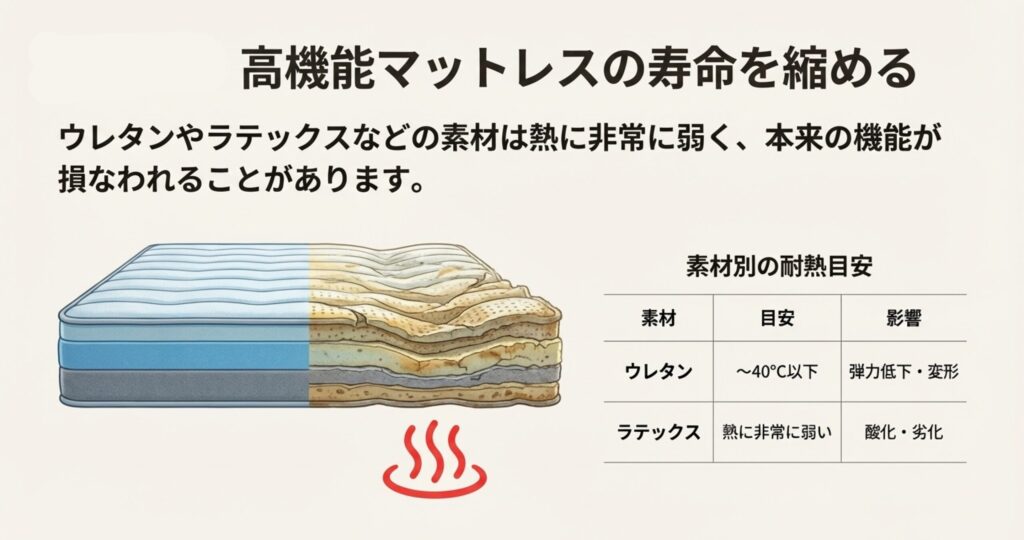 特に低反発ウレタンは、熱が加わりすぎると素材が硬くなってしまったり、逆にふにゃふにゃになって体圧分散機能が壊れてしまったりすることがあります。