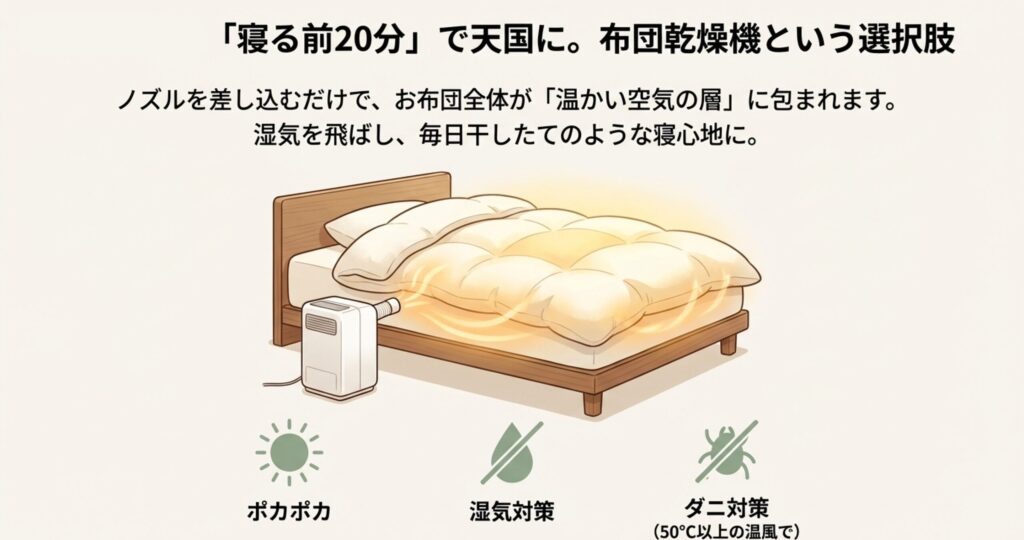 そんな時こそ、布団乾燥機の出番。寝室の空気を汚さずに、お布団の中だけをピンポイントで快適にしてくれる、まさに冬の救世主です。