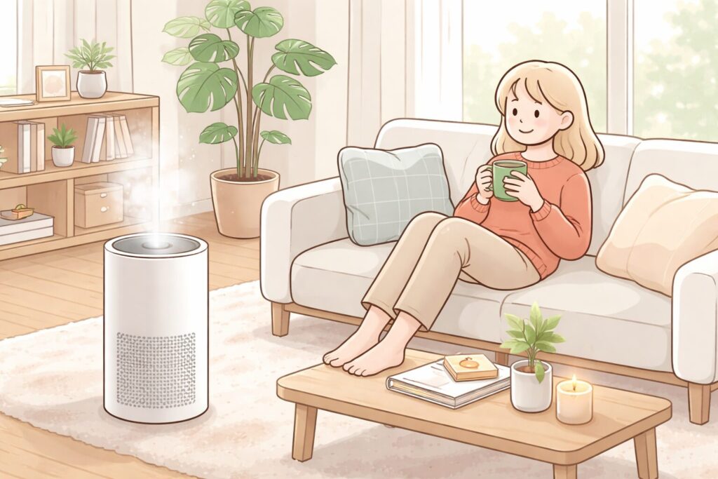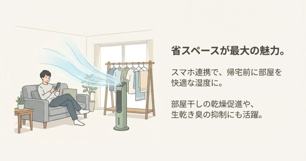 特におすすめなのが、帰宅前にスマホで操作できるWi-Fi連携モデル。外から加湿をスタートしておけば、帰ってきた瞬間にお部屋が潤っていて最高に気持ちいいですよ。