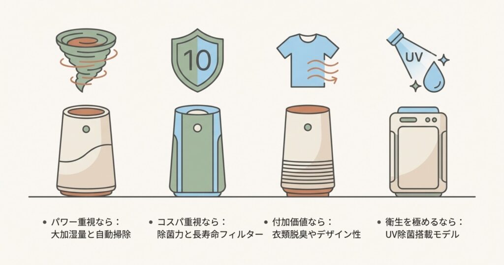 もし、こまめなメンテナンスに自信がないなら、無理に加湿機能を使わずに、空気清浄専用機として割り切るか、あるいは衛生管理に特化したモデルを選ぶのが賢明かも。