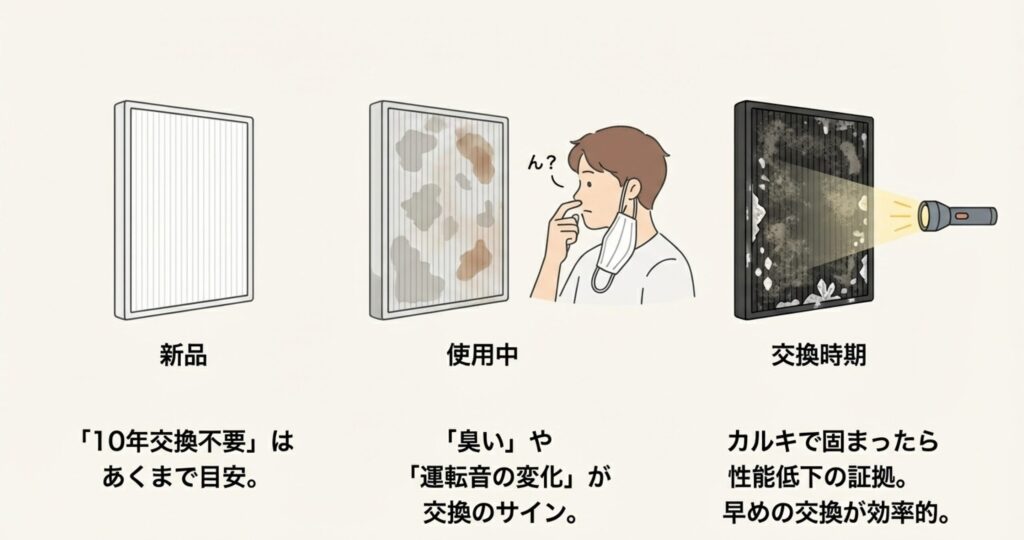 メーカーさんは10年交換不要なんて謳っていますが、タバコを吸う方やペットがいるご家庭だと、実際には数年で目詰まりしてしまいます。この維持費も、買う前にはあまり意識しないデメリットの一つですね。