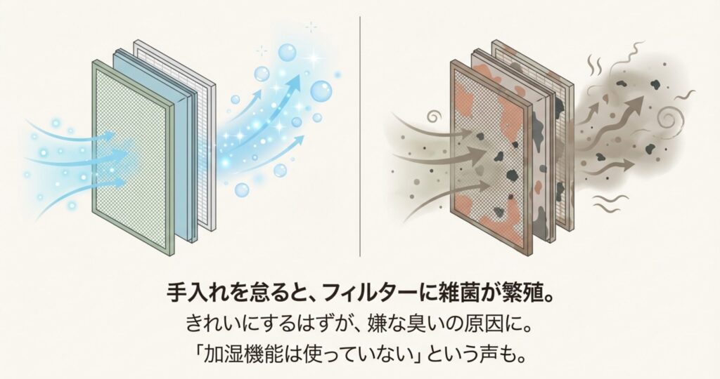 一体型の多くは気化式という仕組みを採用していて、湿ったフィルターに風を当てて加湿するんです。これ、手入れを少しでもサボると、フィルターに雑菌やカビが繁殖しやすくて、せっかく空気をきれいにしているのに、送風口から嫌な臭いが漂ってくることがあるんですよね。