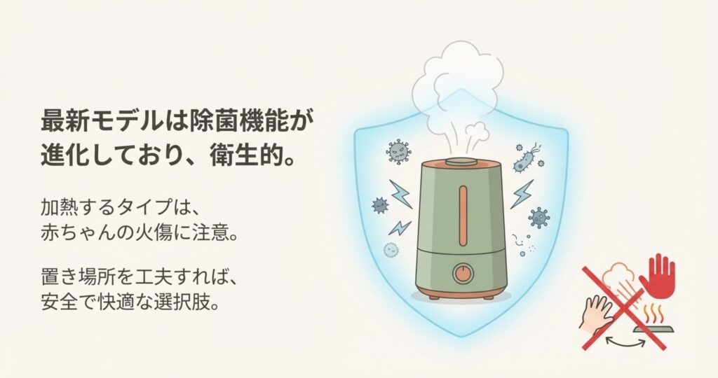 例えば、温風でフィルターを乾かしたり、水の中に抗菌パーツを搭載したりと、むしろ衛生面ではかなり進化しています。ただ、加熱部分があるモデルは、赤ちゃんが触ると危ない場合もあるので、置き場所には注意が必要です。