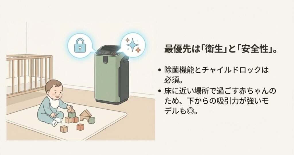 赤ちゃんがいるご家庭では、一番に考えるべきはやっぱり「衛生」と「安全性」ですよね。