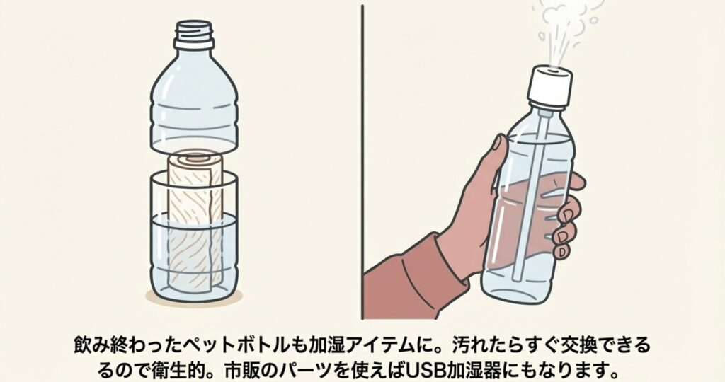 また、最近の流行りとしては、市販の「ペットボトル加湿器」のパーツを取り付ける方法もあります。
