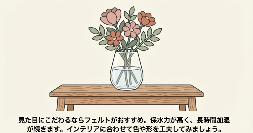フェルトは厚みがある分、ペーパーよりも保水力が高く、長時間しっとりとした加湿が続きます。お花や葉っぱの形に切れば、インテリアとしても可愛くて、お部屋の雰囲気を壊しません。