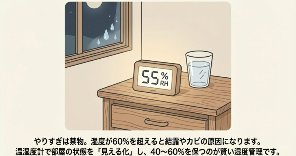 一番怖いのは、過剰な加湿による「結露」と「カビ」です。