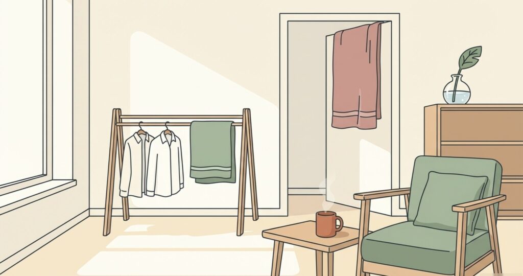 一番簡単なのは、リビングに洗濯物を干すことですよね。実はこれ、私も冬の間はフル活用している技なんです。お洗濯が終わった後の湿った衣類からは、驚くほど大量の水分がお部屋に放出されます。