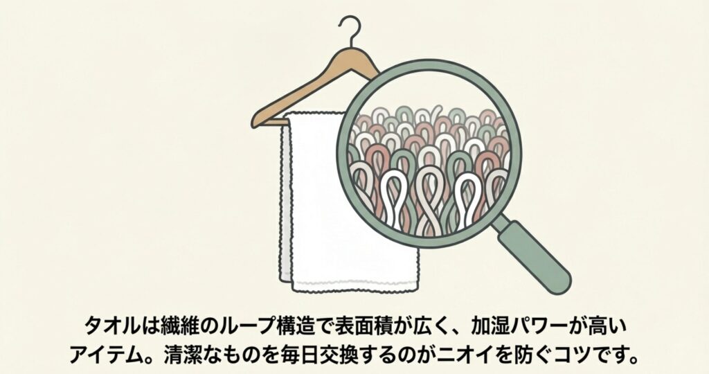 古いタオルや汚れが落ちきっていないものを使うと、加湿と同時にお部屋にニオイを撒き散らすことになっちゃいます。加湿器の代わりになるものとして使うなら、必ず「洗いたての清潔なタオル」を選んで、毎日交換するのが鉄則ですよ。
