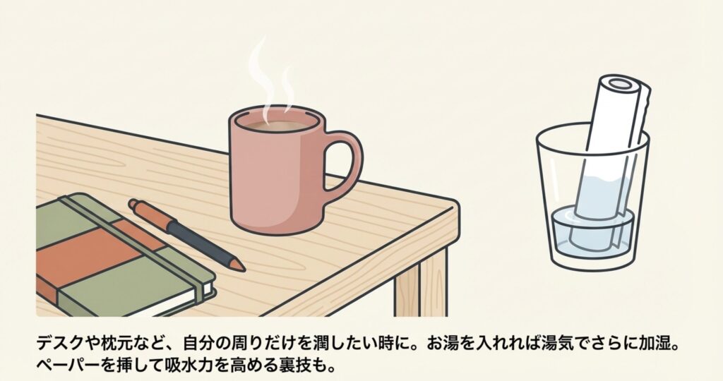コップにただ水を入れるだけでなく、そこにキッチンペーパーを数枚丸めて挿しておくと、ペーパーが水を吸い上げて空気に触れる面積が広がり、加湿力がアップします。見た目はちょっと「工作」っぽくなりますが、手軽さ重視の方にはおすすめの小技です。