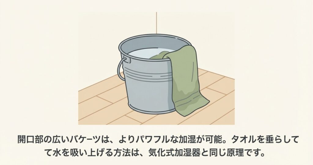 さらに加湿力を高めるなら、バケツの縁にタオルを引っ掛けて、タオルの半分を水に浸し、もう半分を外側に垂らす「吸い上げ式」が最強です。