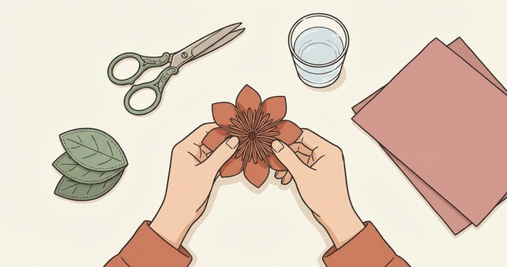 お家にあるもので言えば、フェルトや不織布、コーヒーフィルターなどがおすすめ。これらを蛇腹折りにしたり、お花の形にカットしたりして、お水の入った容器に挿すだけで完成です。