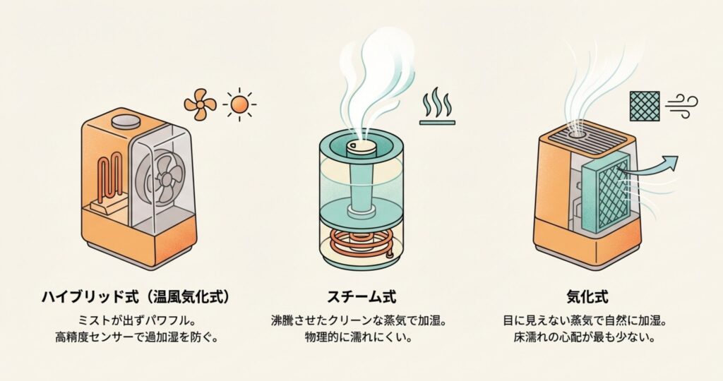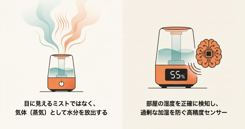 まず、水を沸騰させて出すスチーム式なら、出てくるのは「気体」なので、床に落ちることなくお部屋全体に広がります。これは物理的に濡れにくい最強の条件と言えますね。