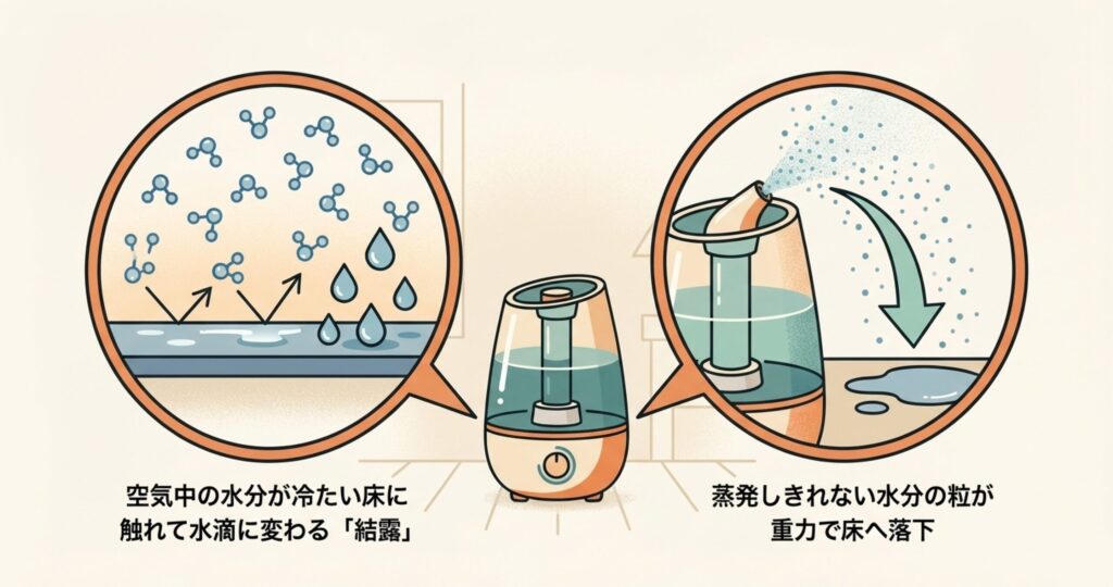 暖かい空気はたくさん水分を持てるけれど、冷たい空気は少ししか持てません。加湿器で潤った空気が、冷え切った床や窓際に触れると、急激に冷やされて水に戻ってしまうわけです。