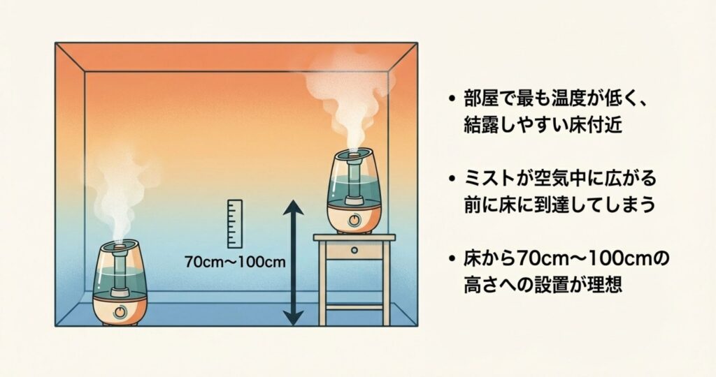 床から出すと、ミストが空中に漂う時間が短すぎて、蒸発する前に床に到達してしまいます。これが「加湿器の周りだけ濡れる」という状況を生むんです。