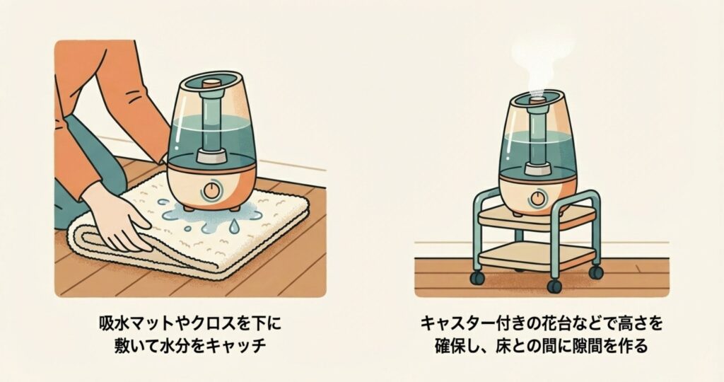 私もプライベートでよく使っていますが、ダイソーやセリアにある「PVA吸水クロス」や「吸水マット」を加湿器の下に敷いておくだけで、万が一の濡れを最小限に防げます。
