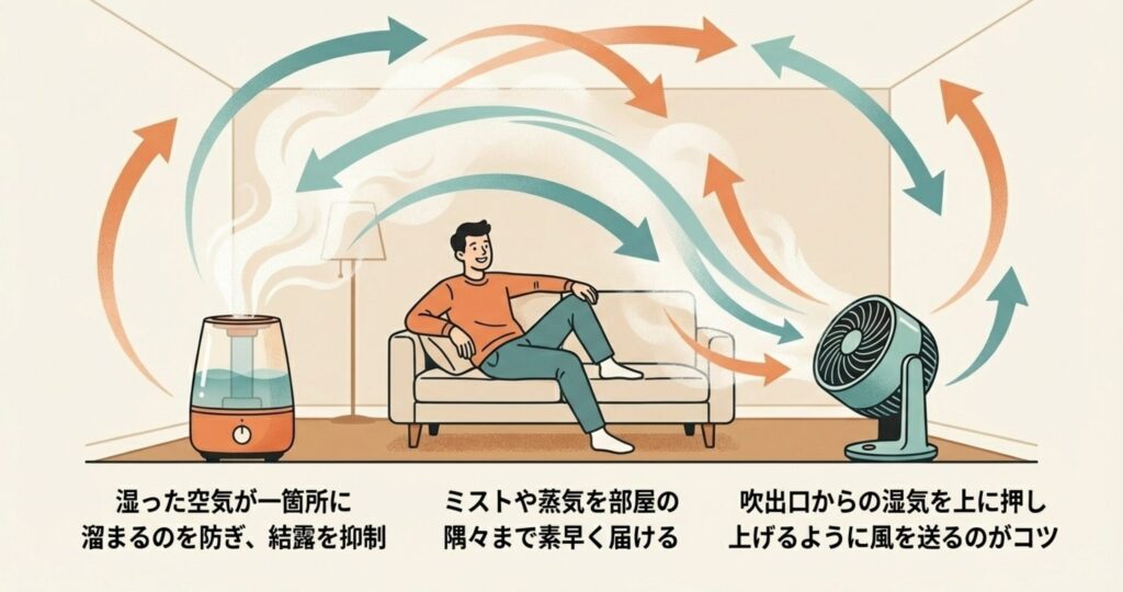 サーキュレーターを使うときは、加湿器の吹出口から出たばかりの湿気を上に押し上げるように風を送るのがポイント。これにより、ミストが床に落ちる時間を稼ぎ、空中でしっかり蒸発させることができます。