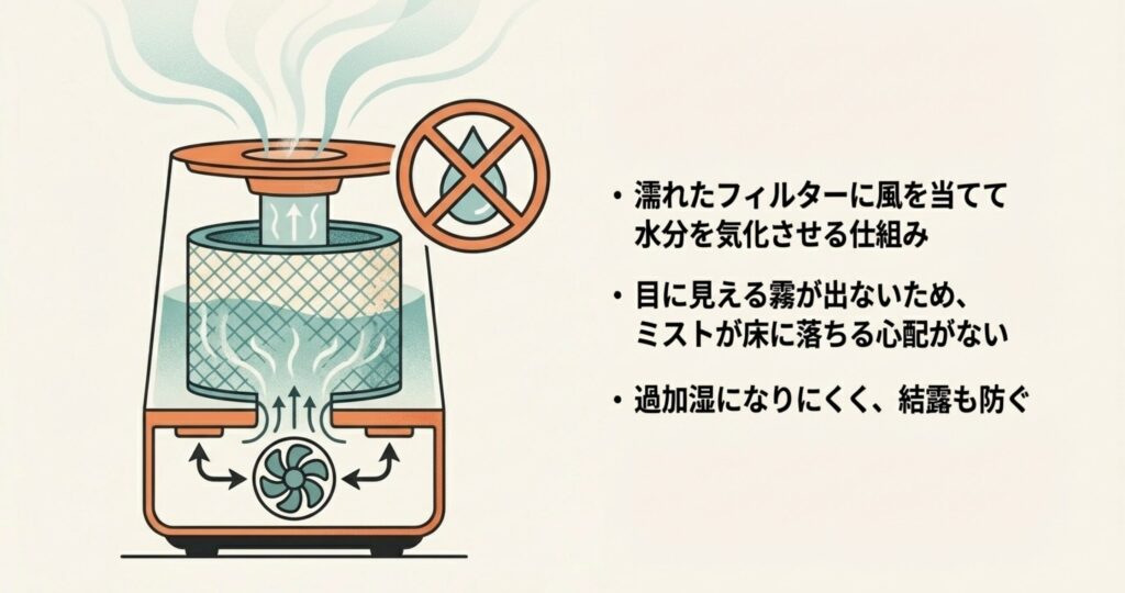 そんな時に見てほしいのが、フィルターに風を当てて気化させる「気化式」や「温風気化式」です。これらは、そもそも霧(ミスト)を飛ばさないので、超音波式のような「ミストが落ちて水たまりになる」というトラブルがほとんどありません。