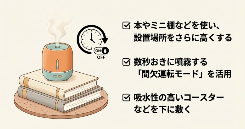卓上タイプはパワーが限られているので、高い場所に置くだけでミストが拡散しやすくなります。私は100均のミニ棚や、厚手の本の上に乗せて少しでも高さを稼ぐようにしています。