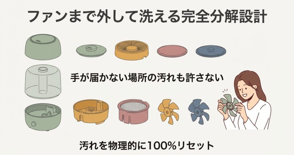 普通の加湿器だと、どうしても手が届かない風路の奥にホコリが溜まったりしますよね。ミロなら、ミストが出るファンまで取り外して洗えちゃいます。