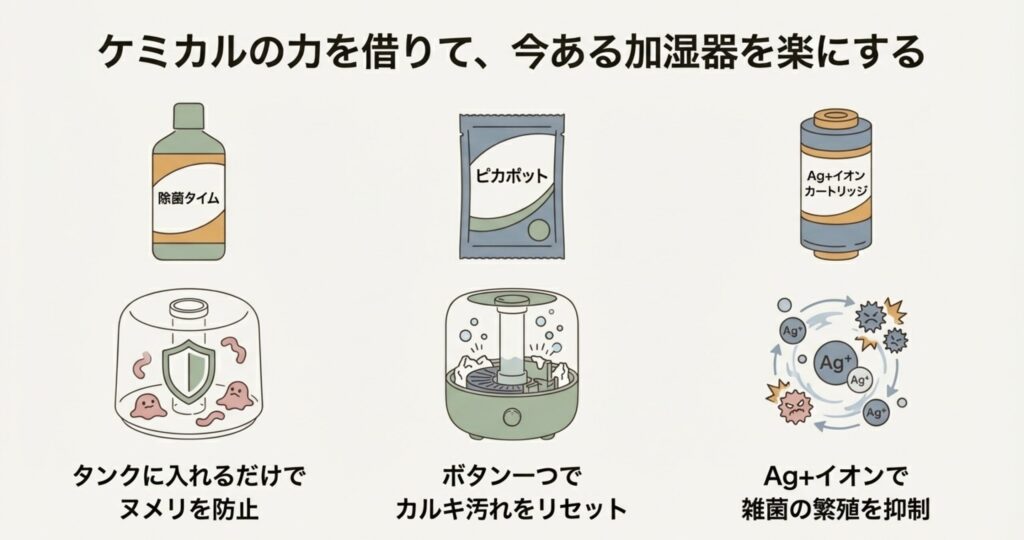 今使っている加湿器を、少しでもメンテナンスフリーに近づけたいなら、ケミカルの力を借りるのが賢い方法です。