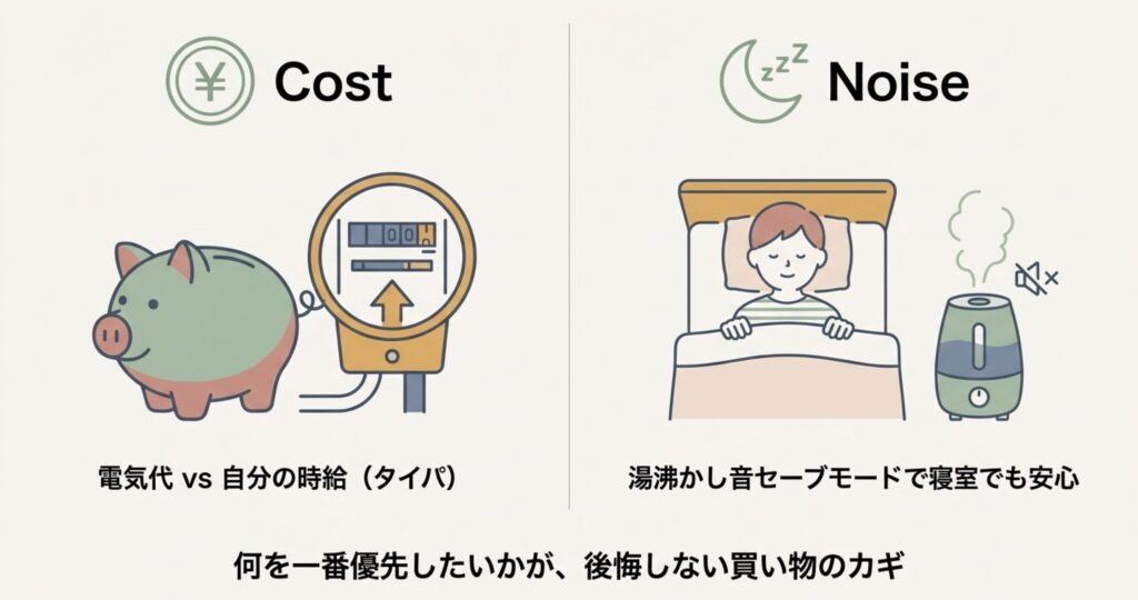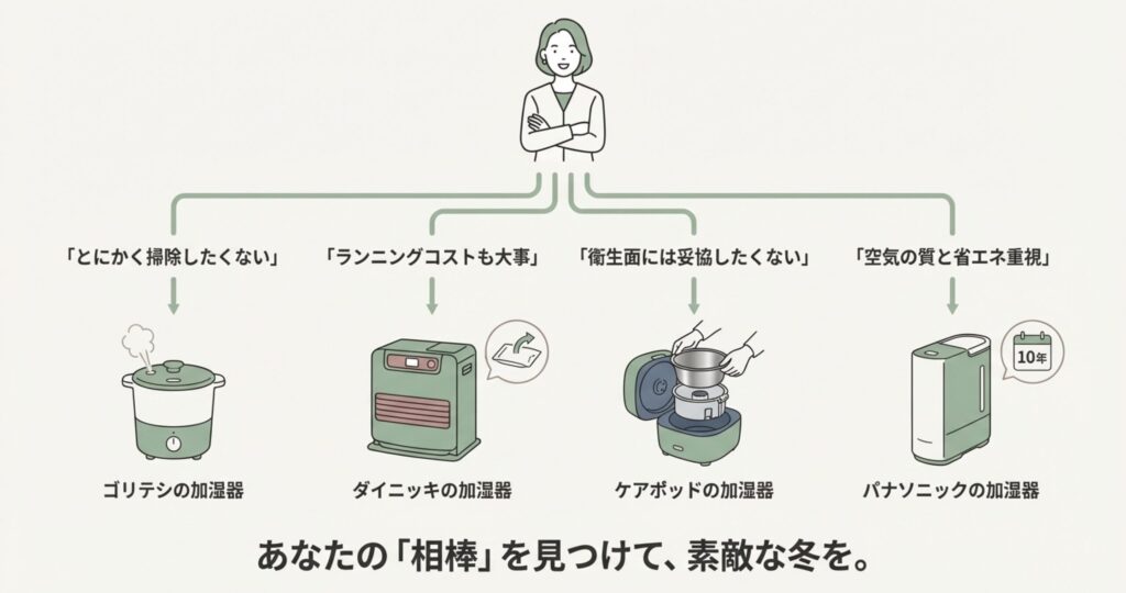 加湿器のメンテナンスフリーをどう捉えるかで、正解は変わります。
