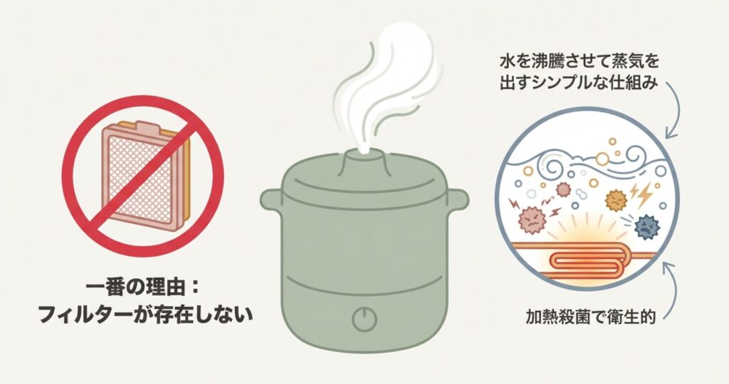 加湿器の掃除で何が一番嫌かって、あの網目状のフィルターを押し洗いしたり、カビが生えないかヒヤヒヤしたりすることですよね。スチーム式はその心配が構造的にありません。