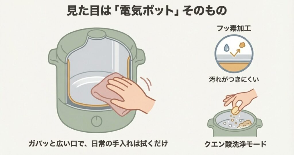 代表的なモデルである「EE-DE50」や「EE-DE35」を見てみると、もう見た目からして「電気ポット」そのもの。蓋を開ければガバッと広い口が開いているので、中をタオルでさっと拭くだけで日常の手入れが終わっちゃいます。