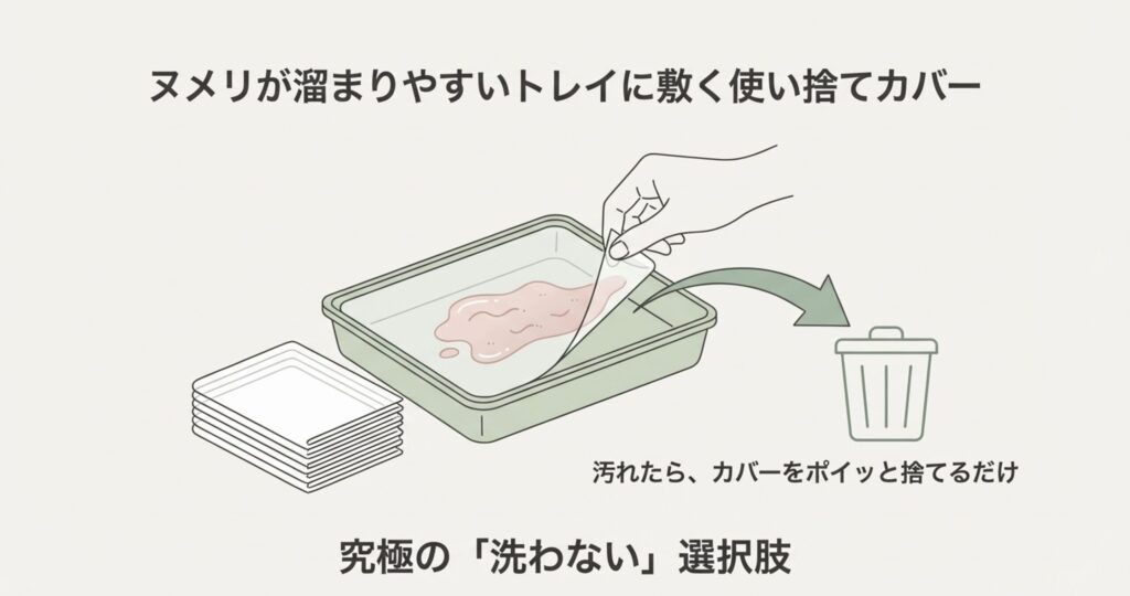 汚れが溜まったら、カバーをポイッと捨てて新しいものに取り替えるだけ。トレイをゴシゴシ洗う必要が一切ないので、これこそ究極の「洗わない」選択肢ですよね。