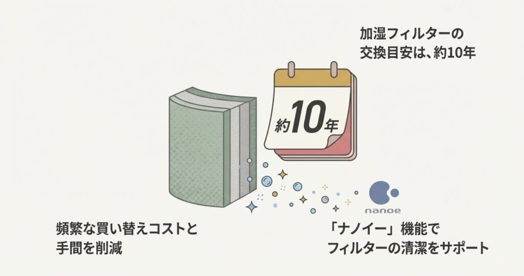 気化式はフィルターの手入れが必須と言われてきましたが、パナソニックの「FE-KX07C」などは、加湿フィルターの交換目安がなんと約10年(型番:FE-ZKE07)と、ものすごく長寿命なんです。