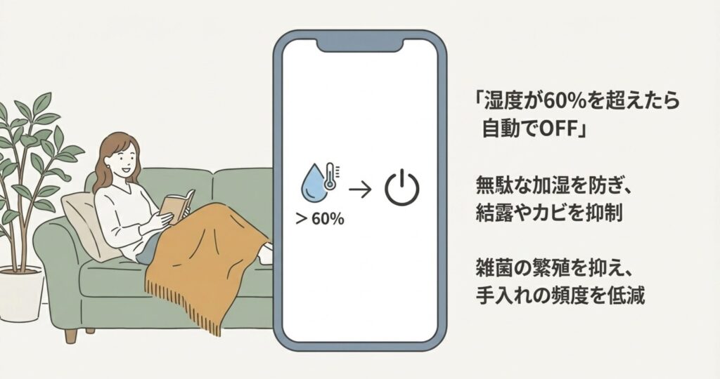 温湿度計と連携させて、「湿度が60%を超えたら自動でOFF」という設定にしておけば、無駄な加湿を防げます。