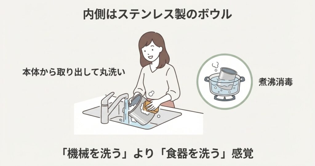 内側の水を入れる容器が、なんとステンレス製のボウルのような形状になっていて、本体から取り出してそのまま丸洗いできるんです。