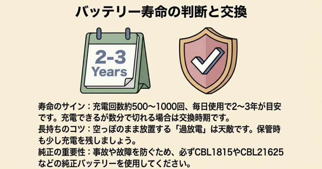 アイリスオーヤマの「CBL1815」や「CBL21625」など、お使いの型番に合った純正バッテリーを正しく選ぶことが、結果として一番安上がりで安全な選択になりますよ。