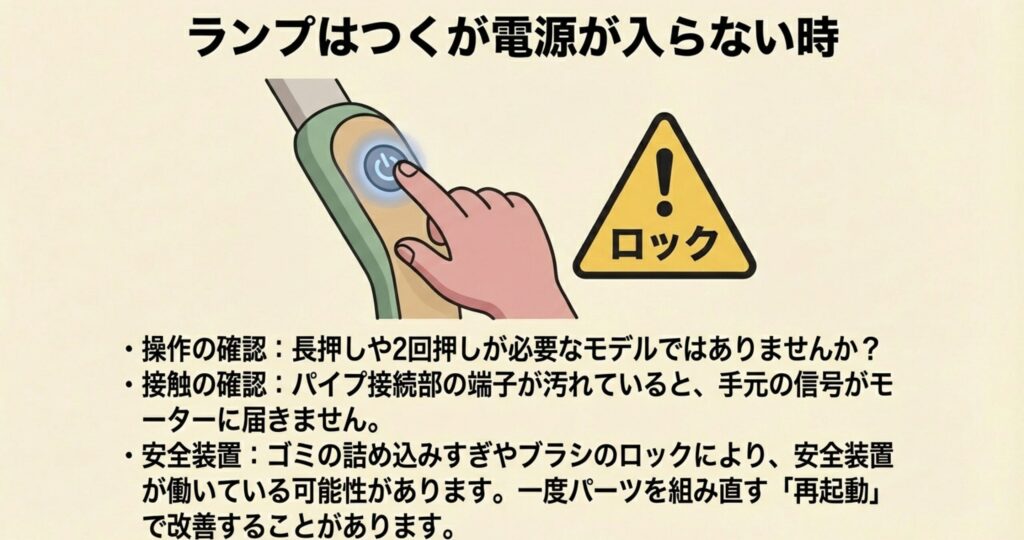 特にパイプを外してハンディとして使えるタイプは、パイプの接続部にある端子が汚れていると、電気がモーターまで届かなくなります。
