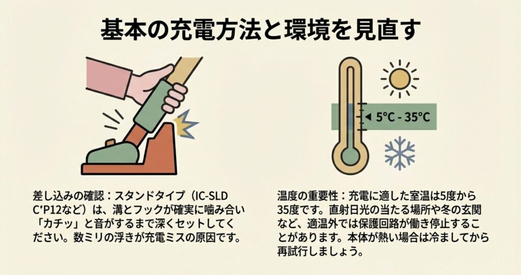 「IC-SLDCP12」のようなスタンドタイプの場合、本体の溝がスタンドのフックに確実に接続されていないと電気は流れません。カチッと音がするまで、あるいは本体が安定するまで深くセットするのがコツですよ。